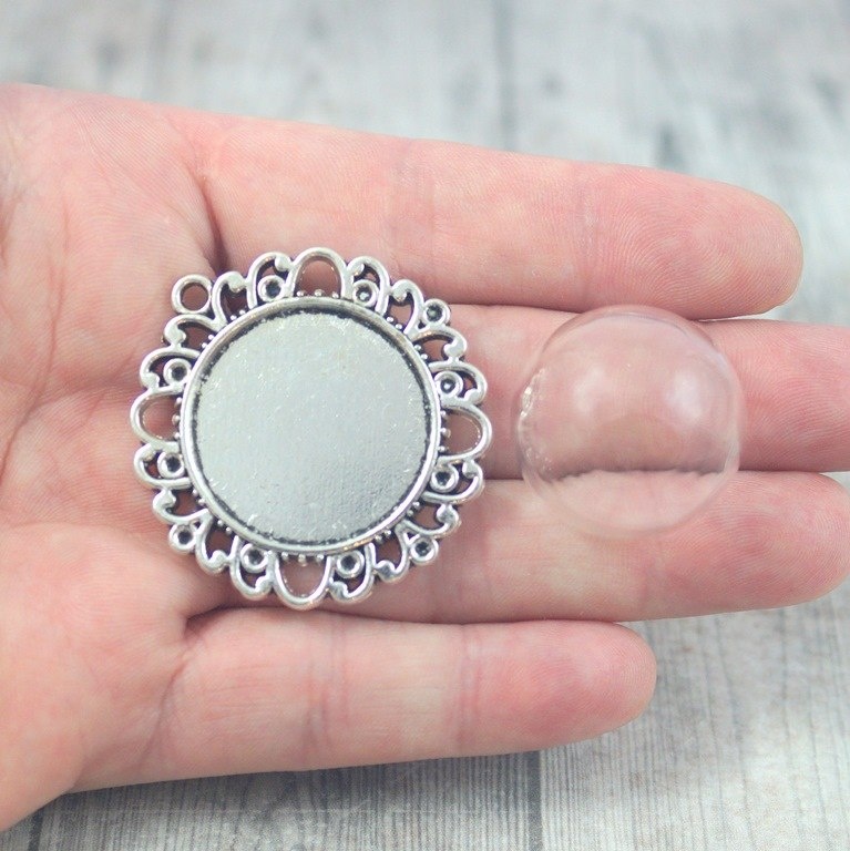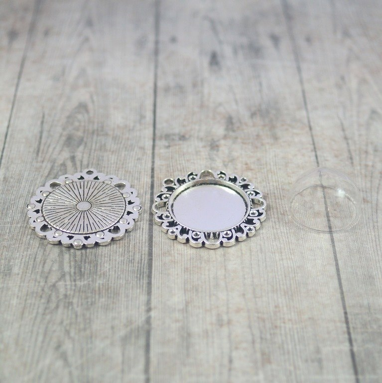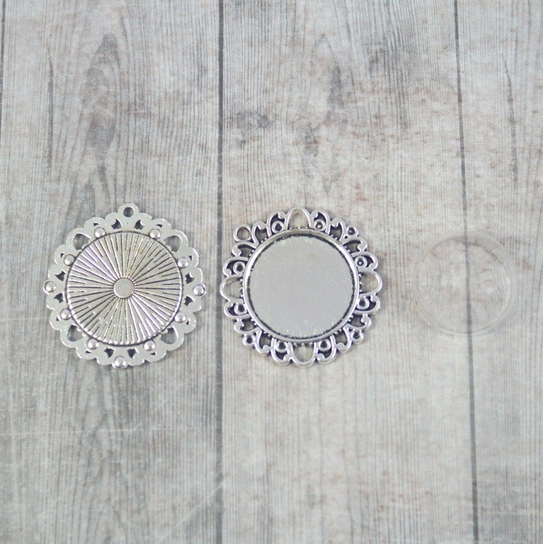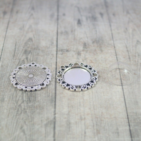 Zestaw zawiera bazę kaboszona w kolorze srebrnym o średnicy całego wisiorka 38,9 mm ,