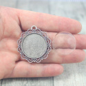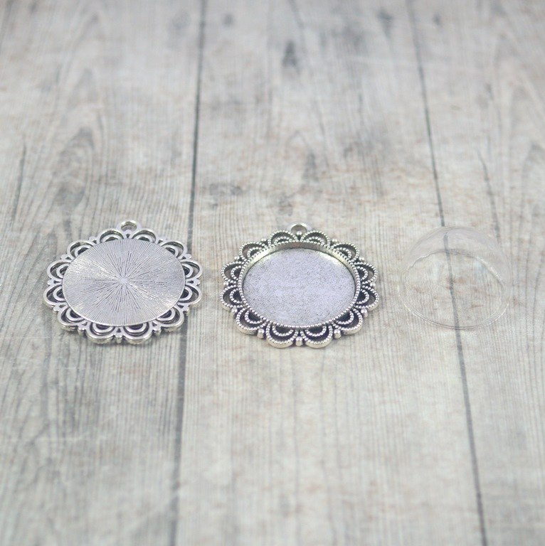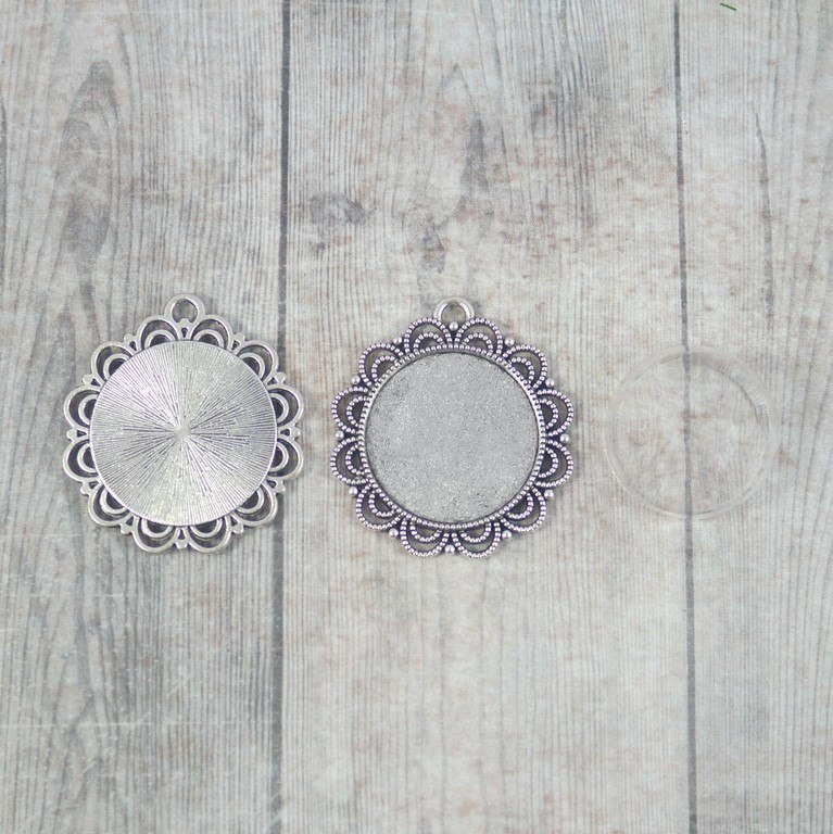 Zestaw zawiera bazę kaboszona w kolorze starego srebra o średnicy całego wisiorka 36 mm ,