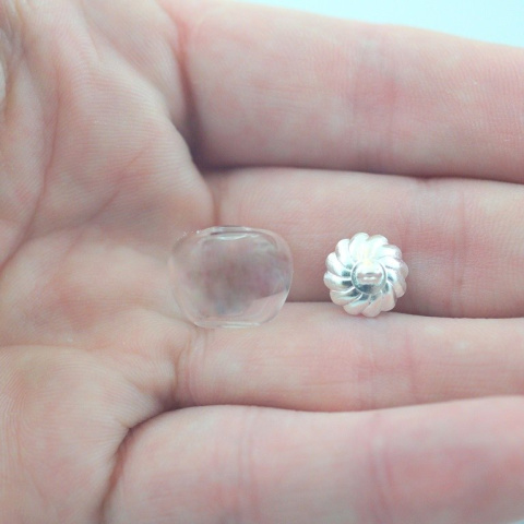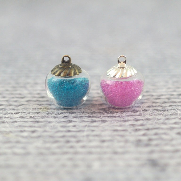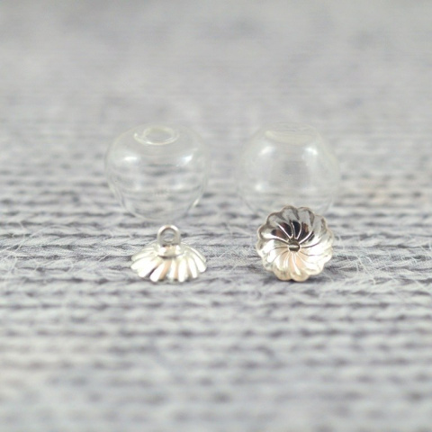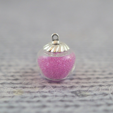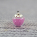 Wisiorek szklany w kształcie jabłuszka , wysokość 12 mm , średnica w najgrubszym miejscu 15 mm , średnica otworu 3 mm , średnica metalowej zawieszki ozdobnej w kolorze srebrnym 9,5 mm + koreczek gumowy.
