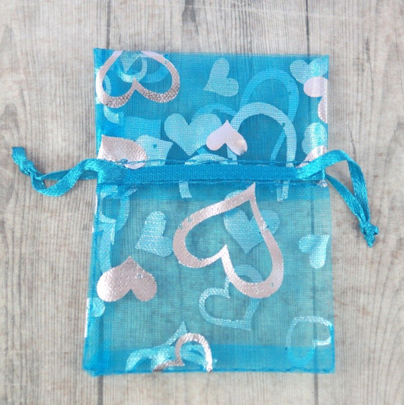 Woreczek z organzy w kolorze błękitnym z srebrnymi serduszkami o wymiarach 9 x 6,5 cm