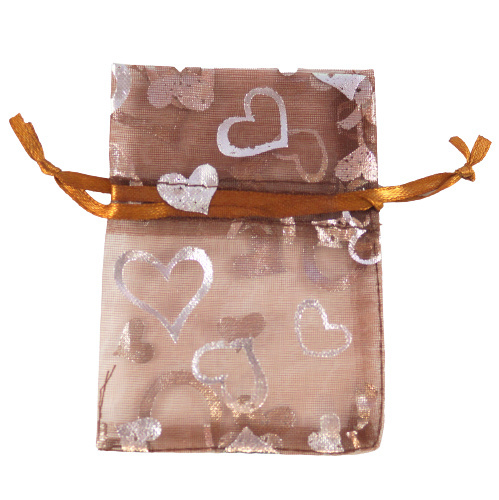 Woreczek z organzy w kolorze brązowym z srebrnymi serduszkami o wymiarach 9 x 7 cm.