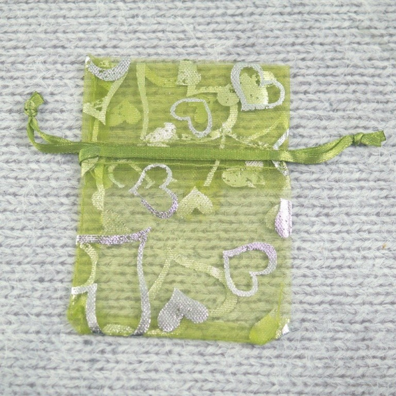 Woreczek z organzy w kolorze zielonym z srebrnymi serduszkami o wymiarach 9 x 7 cm