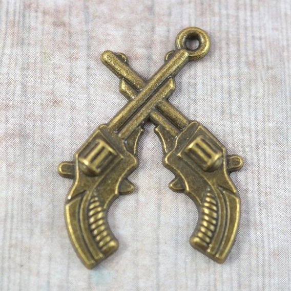 Zawieszka jednostronna 2 rewolwery w kolorze starego złota ,o wymiarach 30x24x1,6 mm .