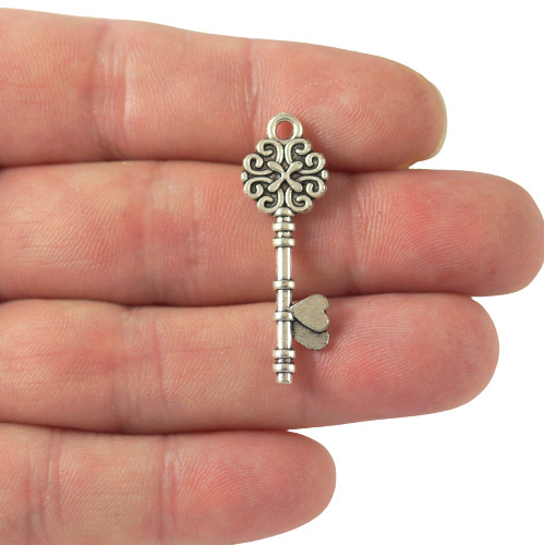 Zawieszka dwustronna antyczny kluczyk w kolorze srebrnym o wymiarach 33x11x2 mm .