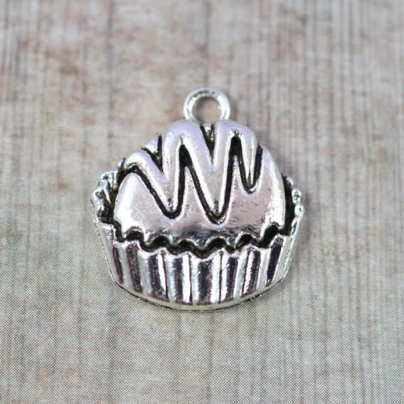 Zawieszka babeczka jednostronna w kolorze srebrnym o wymiarach 20x19x3,8 mm.