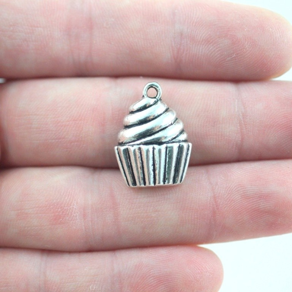 Zawieszka jednostronna babeczka w kolorze srebrnym o wymiarach 20x14x4,4 mm.