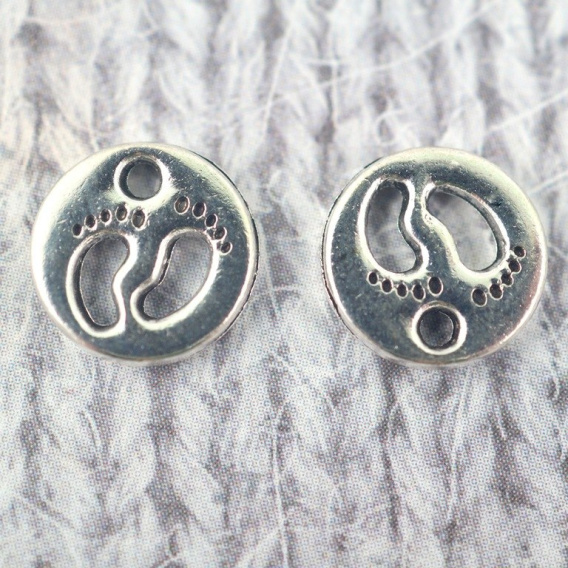 Zawieszka okrągła małe dwie stópki w kolorze srebrnym o średnicy 11 mm i grubości 1,7 mm. Cena za 1 szt.