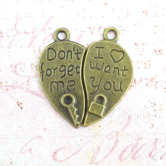 Zawieszka dwuczęściowa -dwie połówki serca lewa DON'T FORGET ME (niezapomnij mnie ),prawa I WANT YOU (chcę Ciebie ) .