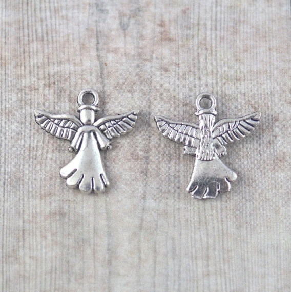 Zawieszka dwustronna anioł rozłożone skrzydła i anielskie włosy w kolorze srebrnym ,o wymiarach 20x20x2,2 mm