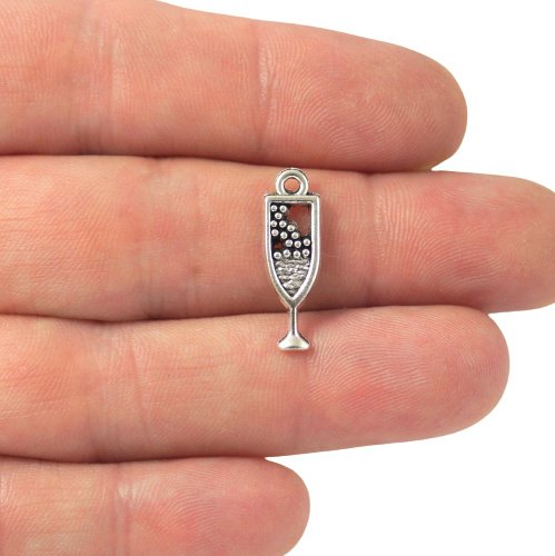 Zawieszka jednostronna w kolorze srebrnym kieliszek do szampana , o wymiarach 20x7x1,7 mm.
