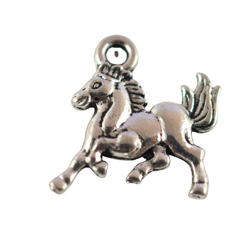 Zawieszka dwustronna koń w kolorze srebrnym o wymiarach: 15x14x2,5 mm.