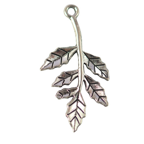 Zawieszka liść w kolorze srebrnym o wymiarach 30x16x2 mm.