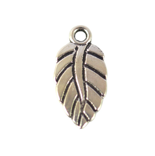 Zawieszka dwustronna liść w kolorze srebrnym o wymiarach: 19x10x1,2 mm.
