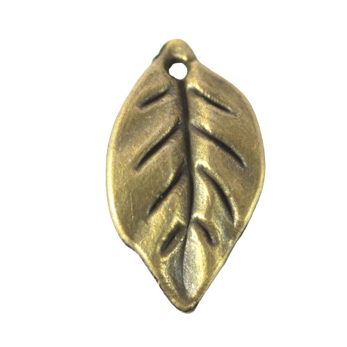 Zawieszka dwustronna liść w kolorze starego złota o wymiarach: 25x14x1,8 mm.