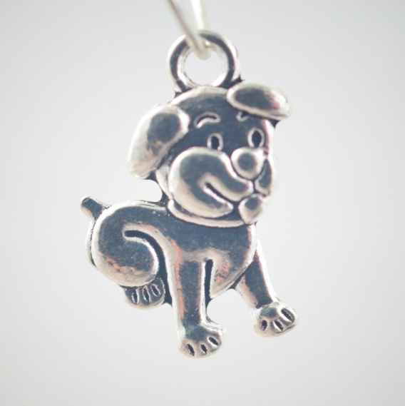 Zawieszka dwustronna w kolorze srebrnym wesoły piesek o wymiarach 18x12x3 mm.