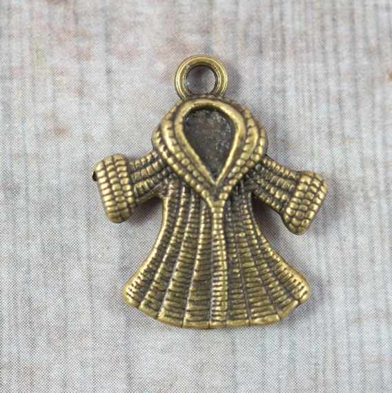 Zawieszka płaszcz w kolorze starego złota o wymiarach: 22x18x2,9 mm.