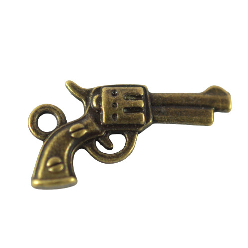 Zawieszka dwustronna rewolwer w kolorze starego złota , o wymiarach 22x11x3 mm .