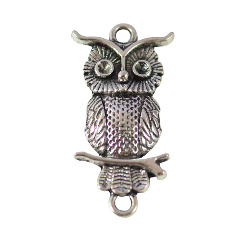 Zawieszka sowa jednostronna w kolorze srebrnym o wymiarach 33x17x4 mm.