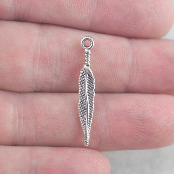 Zawieszka piórko dwustronne w kolorze srebrnym o wymiarach: 28x4 mm.