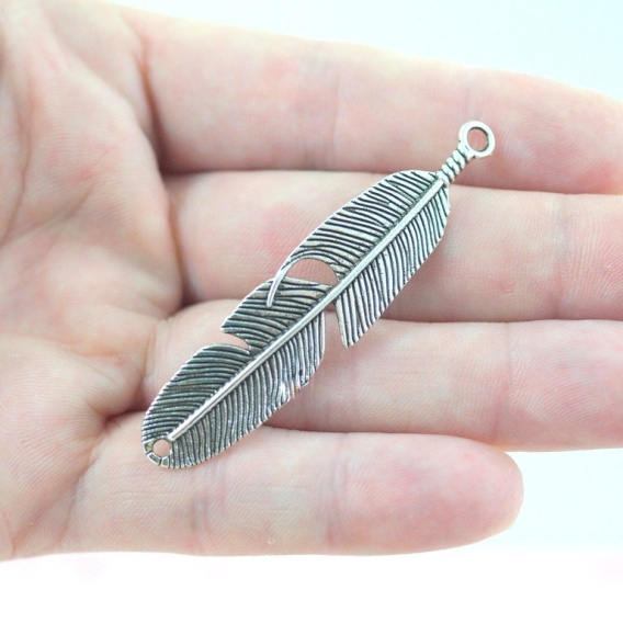 Zawieszka piórko w kolorze srebrnym o wymiarach: 45 x 11 mm ,posiada na końcach otwory, może służyć jako łącznik .