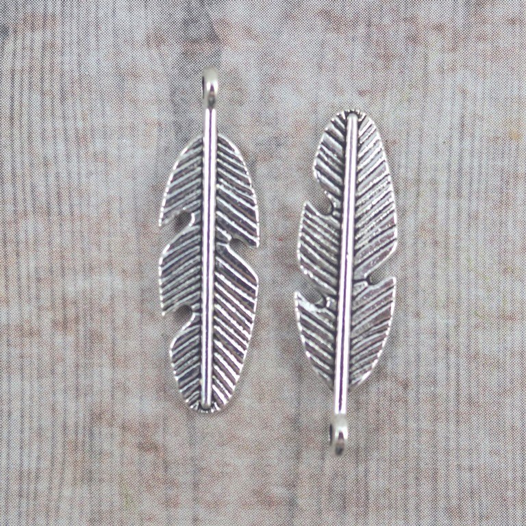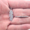 Zawieszka piórko w kolorze srebrnym o wymiarach 28x8x2 mm.