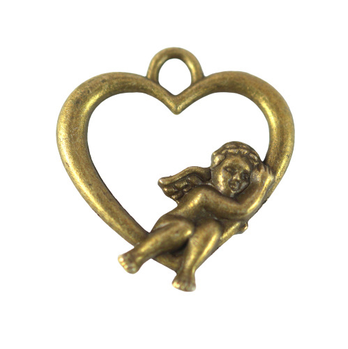 Zawieszka dwustronna serce z aniołkiem w kolorze starego złota , o wymiarach 20x18x3 mm.