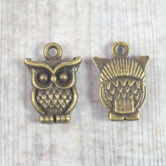 Zawieszka sowa dwustronna w kolorze starego złota o wymiarach 16x12 mm