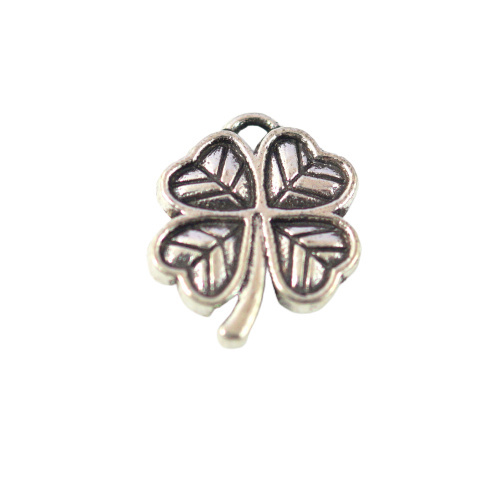 Zawieszka dwustronna w kolorze srebrnym koniczynka o wymiarach 13x11x2 mm.