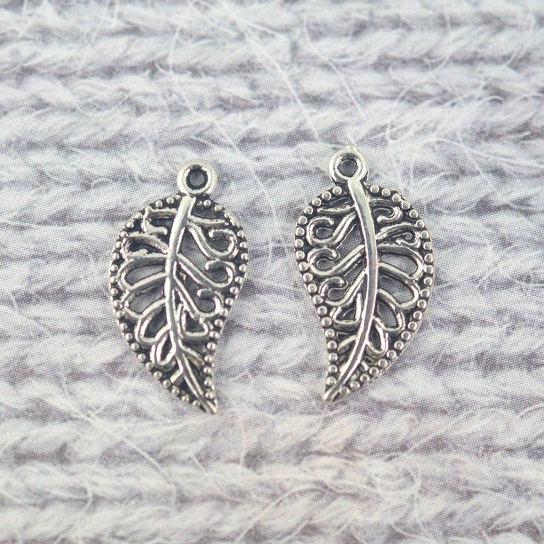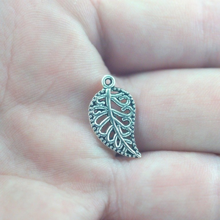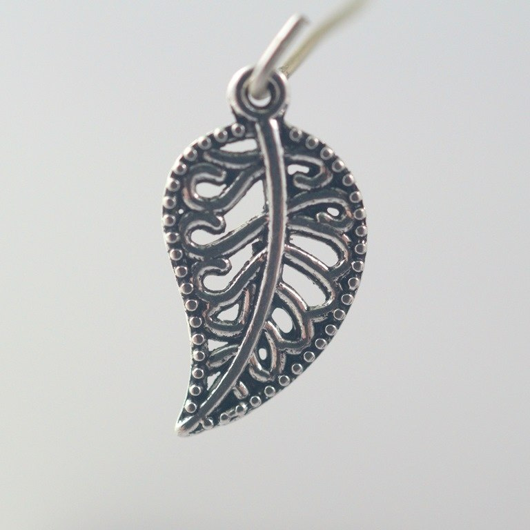 Zawieszka listek w kolorze srebrnym o wymiarach 7x21 mm.