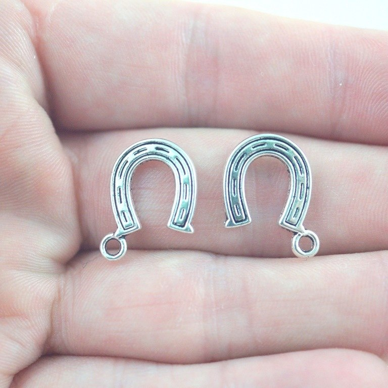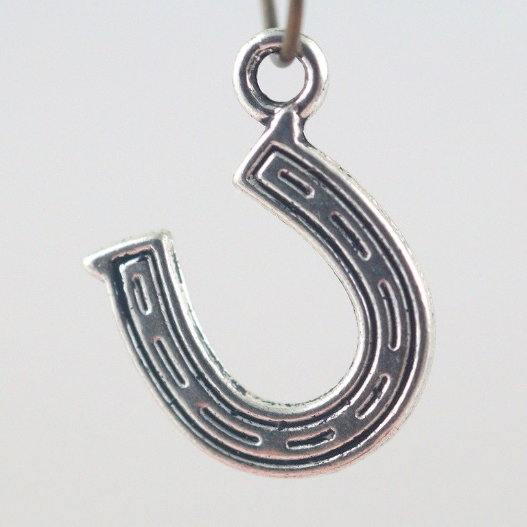 Zawieszka dwustronna w kolorze srebrnym podkówka , o wymiarach 17 x 12 x 1,7 mm