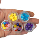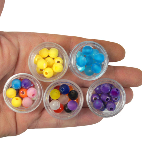 Zestaw koralików plastikowych o średnicy 8 mm. 5 pudełeczek okrągłych zawierającyc od 9 do 12 koralików. Konkretny zestaw kolorów widoczny na zdjęciu. Wymiary pudełka 30x18 mm.